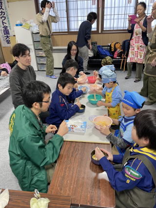 今年は久しぶりに幼稚園のお友達が参加しました。また、餅つきにガールスカウト北海道第1団が参加し、とても賑やかで楽しい集会になりました。